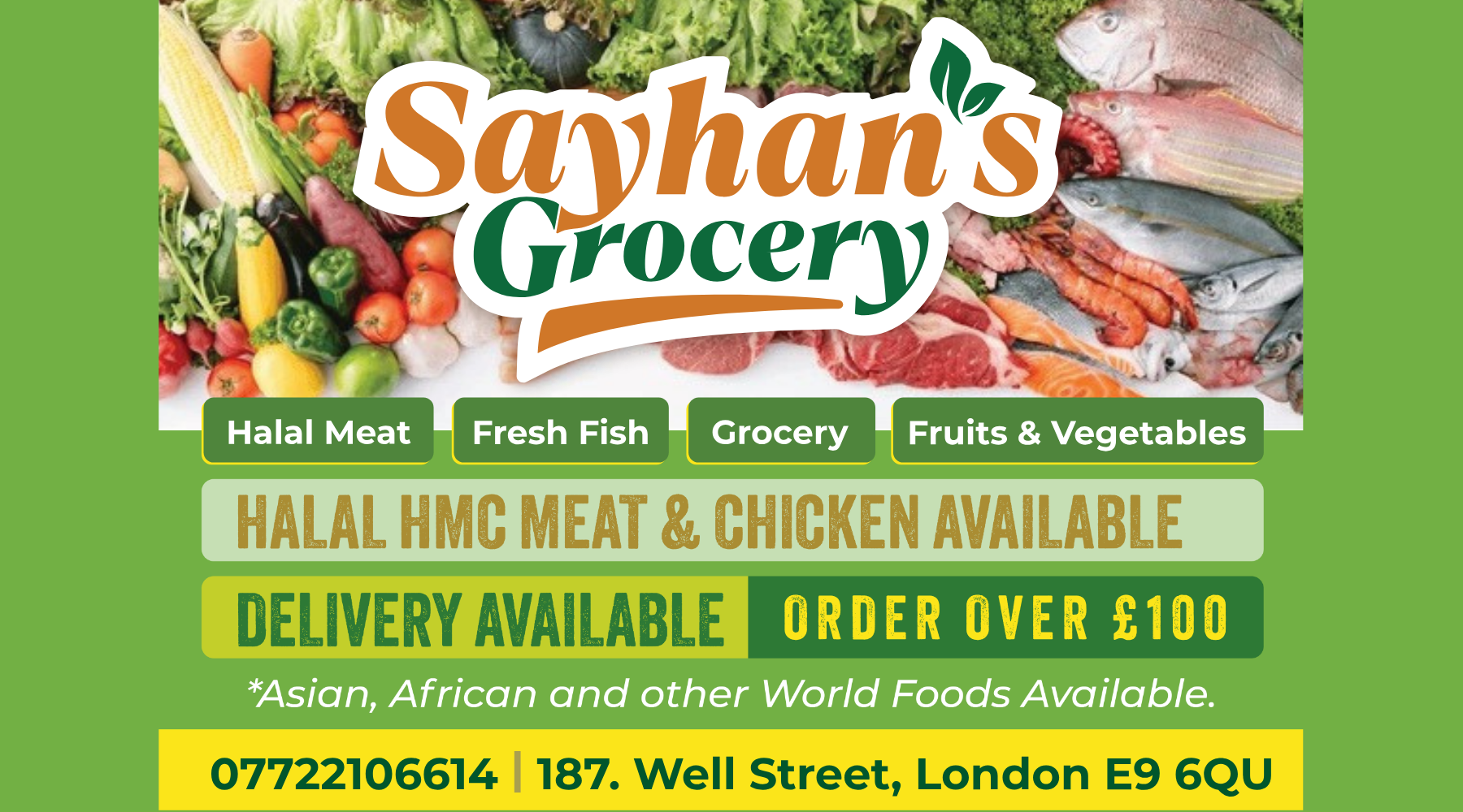 Sayhan’s Grocery is your friendly neighbourhood store for quality halal meat and chicken, handpicked fruit and vegetables, and a wide selection of authentic Indian spices. From everyday essentials like rice, lentils and pulses to frozen fish and favourite confectionery items, we bring quality, freshness, and convenience together under one roof.